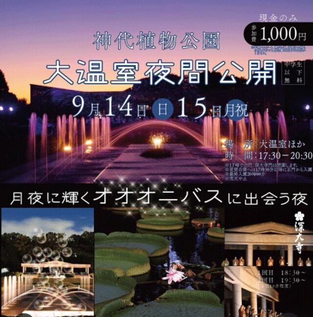 秋の大温室夜間公開イベントに出店します! 普段は見ることのできない夜の植物公園 珍しい熱帯の植物の他にも 噴水のライティングや 七色に輝くシャボン玉など、 お楽しみがたくさん! もちろんキッチンカーも多数出店します! 詳細は神代植物公園の公式サイトにて ご確認ください 【日時】 令和7年9月14日(日)〜15日(月・祝) ※荒天中止 17時30分~20時30分(最終入園20時) 【場 所】 神代植物公園 【参加費】 1,000円(中学生以下は無料)