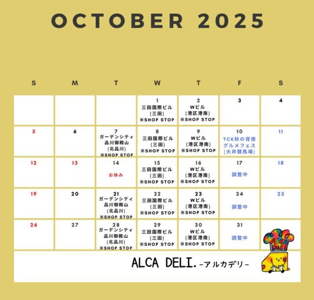 10月の出店予定のお知らせです ◆10月10日(金) 【大井競馬場 秋の背徳グルメフェス】 ◆10月14日(火) 諸事情によりお休みとなります ◆金曜日については調整中です 詳細決まり次第お知らせします 今月も皆様のご来店を心よりお待ちしております . . . 【火曜日】 @東京都品川区北品川6-7-29 ガーデンシティ品川御殿山(shop stop) 11:30~14:00 【水曜日】 @東京都港区三田1-4-28 三田国際ビル(shop stop) 11:30~14:00 【木曜日】 @東京都港区港南1丁目8-15 Wビル(shop stop) 11:30~14:00 【金曜日】 調整中