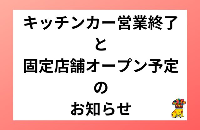 いつもご利用いただきありがとうございます。 このたび新たに固定店舗オープン準備のため、 キッチンカーでの営業を終了させていただくことになりました。 これまでたくさんのご愛顧をいただき、 心より感謝申し上げます。 キッチンカーでたくさんの方に出会えたこと、 支えていただいたことを胸に これからも皆さまに喜んでいただける お店を目指してまいります。 ぜひ引き続き見守っていただけたら嬉しいです。 今後の情報は Instagram・公式ウェブサイト にてお知らせいたします。 どうぞ引き続きよろしくお願いいたします。 <最終出店日> 火:12月16日 水:12月17日 木:12月18日